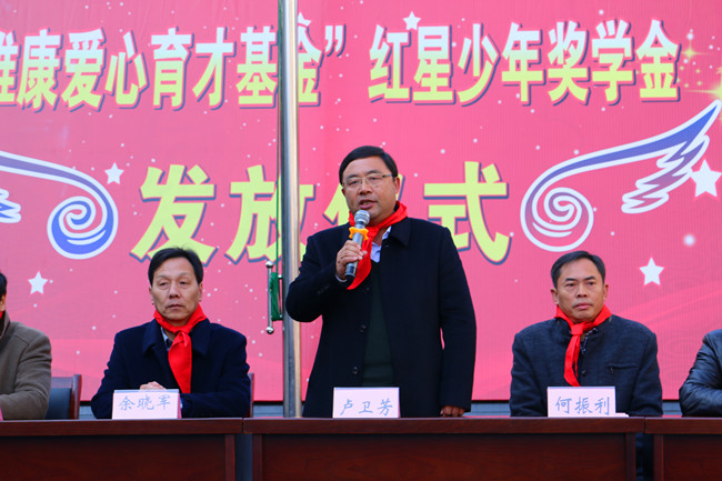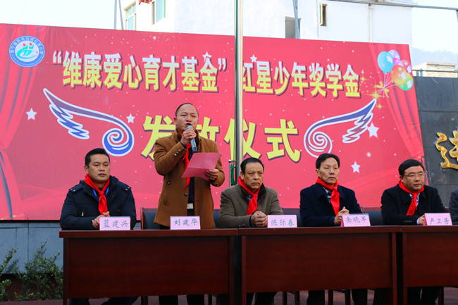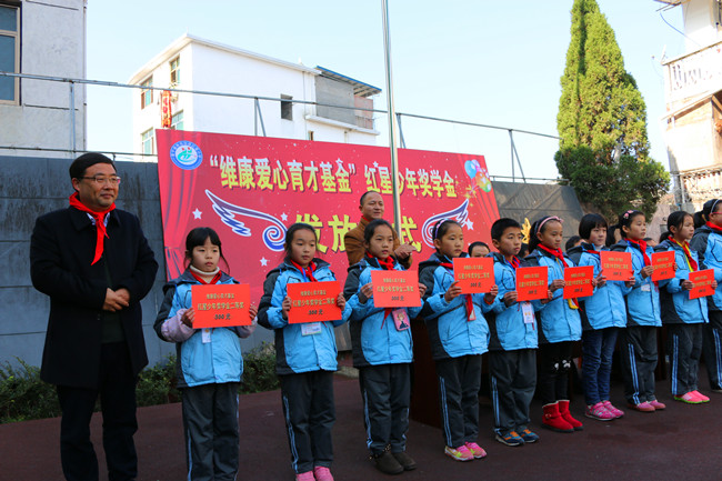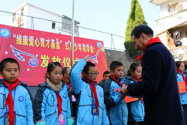 12月16日上午,天氣晴朗,陽(yáng)光明媚,在這冬日里難得的好天氣,讓人格外溫暖的是浙江維康藥業(yè)股份有限公司捐助100萬(wàn)元設立的“維康愛(ài)心育才基金”獎學(xué)金發(fā)放儀式,在景寧畬族自治縣紅星小學(xué)隆重召開(kāi)。景寧畬族自治縣人民政府副縣長(cháng)余曉軍,教育局局長(cháng)鐘利海等領(lǐng)導參加發(fā)放儀式,浙江維康副董事長(cháng)盧衛芳作為“維康愛(ài)心育才基金”副組長(cháng)出席本次儀式。