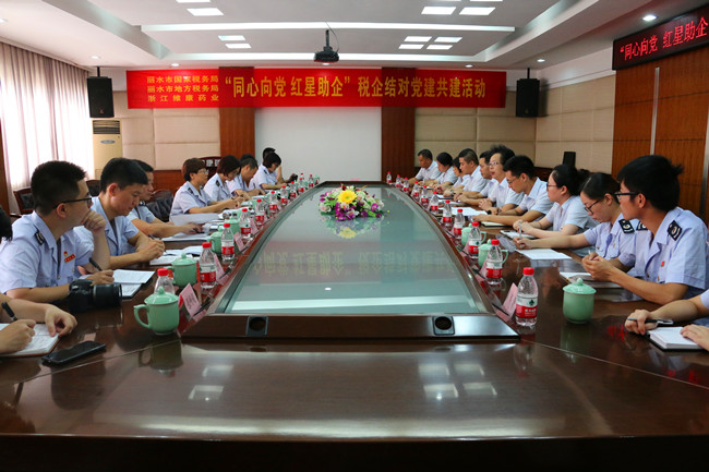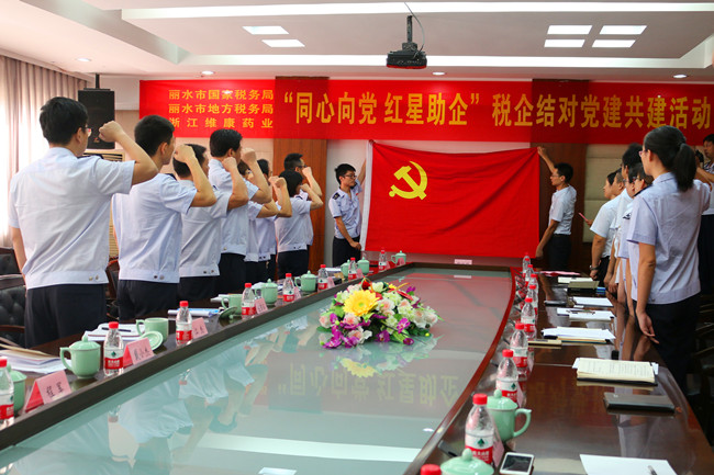 在莊嚴黨旗的見(jiàn)證下,與會(huì )黨員們重溫了入黨誓詞,國地稅代表向企業(yè)贈送了稅務(wù)宣傳資料,拉開(kāi)了麗水國稅、地稅和維康藥業(yè)稅企結對黨建共建的序幕。