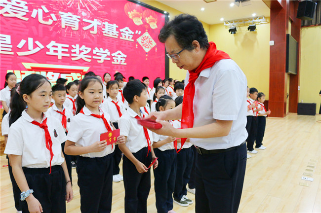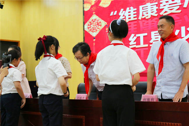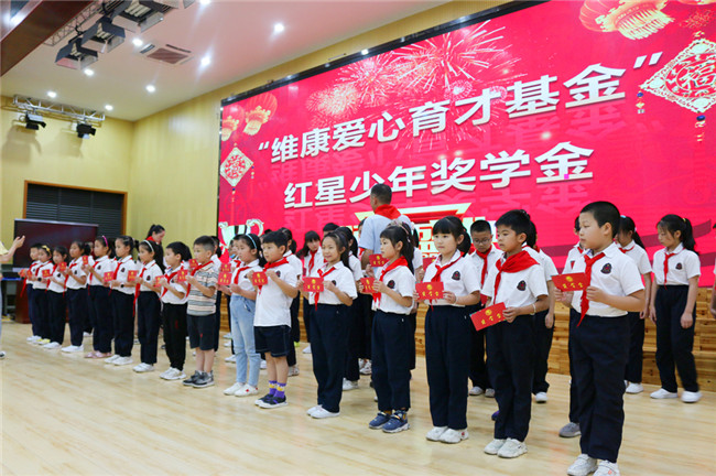 頒獎典禮上,在座領(lǐng)導和嘉賓為獲得2019年度“維康愛(ài)心育才基金”紅星少年獎學(xué)金的同學(xué)們頒發(fā)了獎學(xué)金,鼓勵他們好好學(xué)習,天天向上。紅星小學(xué)的少先隊員代表向與會(huì )領(lǐng)導和嘉賓獻上了鮮艷的紅領(lǐng)巾,表達他們的喜悅與感謝。