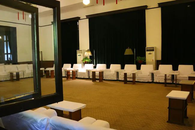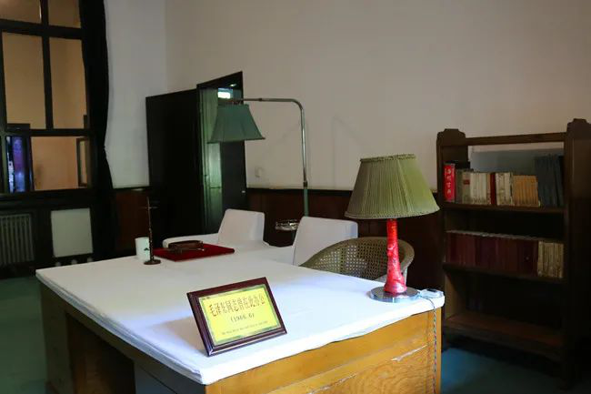 走入滴水洞一號樓,內有一個(gè)會(huì )客廳。穿過(guò)一條20米的走廊,可看到兩間辦公室,其一便是毛澤東辦公的地方,室內一張大辦公桌上,擺著(zhù)一個(gè)毛筆架,一個(gè)茶杯和一個(gè)橢圓形菊花石硯,一個(gè)帶嫩綠色罩子的臺燈,桌前有一只藤椅,還有白套沙發(fā)兩個(gè)。辦公室開(kāi)有三扇門(mén),分別通往會(huì )議室,臥室和北面走廊。