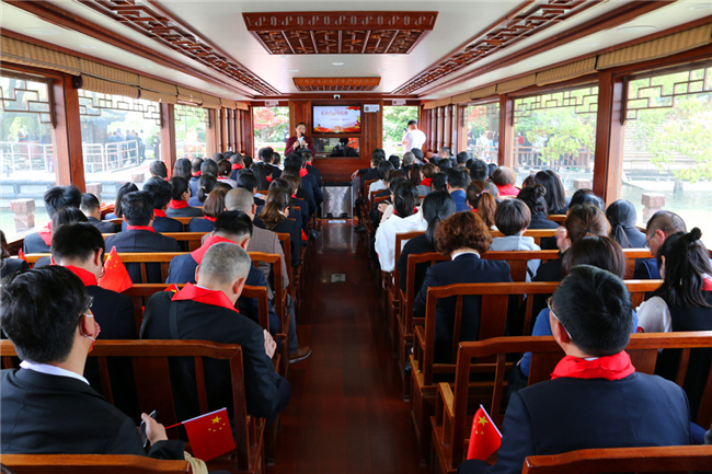 黨課后,大家乘船登上湖心島,小島如一顆璀璨的明珠鑲嵌在南湖之中,島上有煙雨樓等古園林建筑群。在湖畔停泊著(zhù)一艘單夾舫,它就是舉世聞名的中國革命領(lǐng)航船——南湖“紅船”。大家懷著(zhù)崇敬的心情近距離瞻仰這播下中國革命的火種、開(kāi)啟中國共產(chǎn)黨跨世紀航程的革命小船。