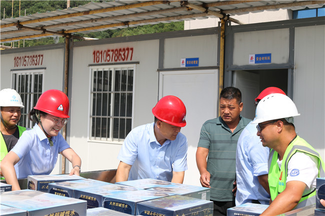 7月20日下午,維康藥業(yè)執行總裁吳建明,黨委副書(shū)記、董事會(huì )秘書(shū)朱婷,項目總監金炳武等慰問(wèn)組一行來(lái)到項目工程現場(chǎng),代表公司向奮戰在一線(xiàn)的建筑工人傳達關(guān)心和慰問(wèn),為他們在公司項目建設中作出的貢獻表示敬意和感謝,并為建筑工人們送上銀黃滴丸、藿香正氣水、仁丹、清涼油、礦泉水等消暑降溫物資,把清涼送到施工一線(xiàn),把關(guān)懷送到工人心坎。